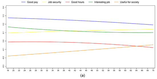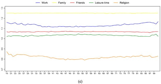 Regarding the importance of other life aspects, it seems that the centrality of friends changes together (but in the opposite direction) with the centrality of work throughout one’s life course (Figure 2a). Friends are very important during the younger ages, they are the least important around age 50, and become more important again after retirement. Family is equally important in every age group, there are only small differences between the young and the old. Leisure time becomes less important with age. This finding is compatible with the change in the importance of work. If we assume that leisure time is defined as the lack of work, it is reasonable that without work as the “point of reference” the importance of leisure time also loses its significance. Simultaneously, when compared with leisure time, religion shows an opposite and stronger trend—i.e., it becomes more and more important with age. We can hypothesise that faith serves as a replacement for leisure, i.e., it fills in the “identity void” left by the decreasing importance of both work and leisure.
