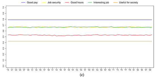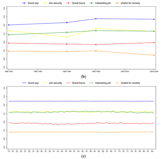 The sign and size of coefficients of the control variables correspond to our expectations (Table A12). For example, for the educated having an interesting and a useful job is more important, whereas good pay, job security, and good hours are less important than for respondents with a low level of education. Compared to those working full-time, self-employed respondents consider job security and good working hours less important. For those married or living with a partner and for those divorced, separated, or widowed, good pay, job security, and good working hours are more important than for singles. Female respondents think that good pay is less important, whereas good hours are more important, which might reflect the distribution of household tasks and breadwinning roles within the family. These findings are in line with previous papers that found that education is related to higher importance of intrinsic and altruistic values [49,51,54], intrinsic and altruistic work values are more important, whereas extrinsic values are less important for women than for men [49,51,55,56], and being married is associated with higher extrinsic values [49,50] (Figure 4).