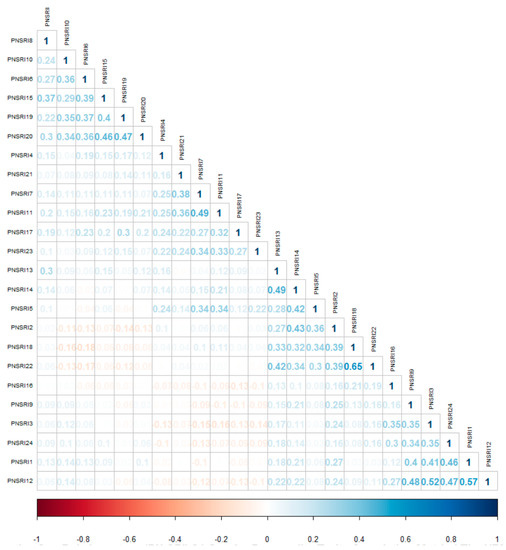 Figure 2 shows a correlation matrix for all 24 PN-SRI items, indicating the four data clusters (MAS+, MAS−, FEM+, FEM−).