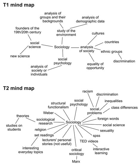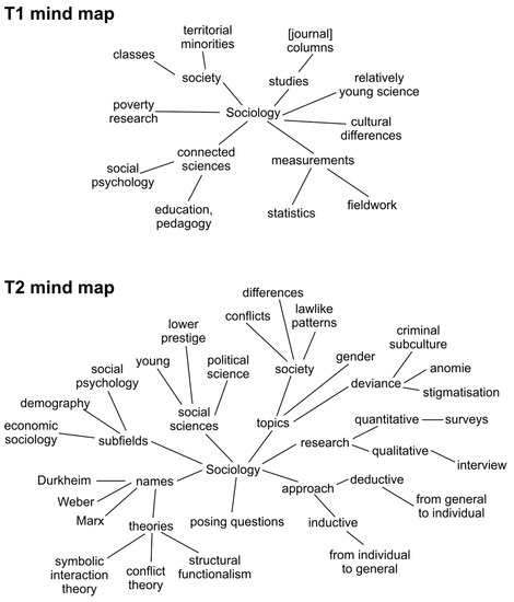 In both T1 and T2, our respondents drew a mind map around the central concept of “Sociology” (this was the only instruction). Thus, the T1 mind map represents their initial knowledge and the T2 one their knowledge at the end—recalled freely and registered expressively, showing connections between key parts without having to adopt the subtleties of a social scientific language. By comparing these two diagrams, we sorted each to one category of the qualitative learning outcome variable: deep or surface learning. Our guidelines for this categorization resemble closely those of Hay [41], who measured learning outcomes with a similar type of diagram (concept map). The basis of categorization was always the T2 diagram. The hallmarks of the two learning outcomes are as follows.
