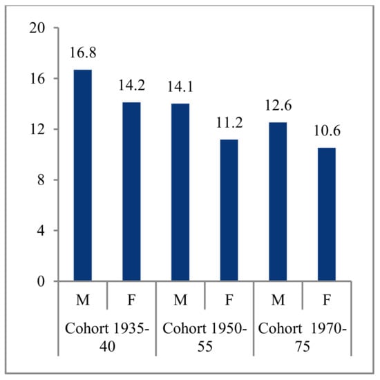 | Cohort 1935–1940 | Cohort 1950–1955 | Cohort 1970–1975 | ||||||||
