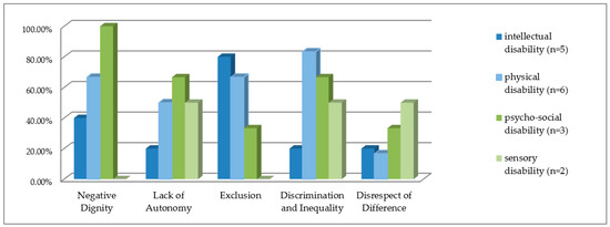 Considering human rights principles, all participants reported at least one situation related to work and employment in which they felt that human rights principles were protected or violated. None of the interviewees experienced violations in regard to all five principles; however, three participants reported that four out of the five human rights principles considered in this study had been violated. Six participants reported that three human rights principles had been violated. Depending on the type of disability, the experienced human rights implications differed to a great extent; while people with an intellectual disability reported a high prevalence of exclusion (four out of the five interviewees), people with a physical disability reported the highest prevalence of feeling discriminated against (five out of six interviewees) (see