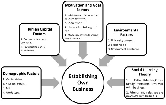 Major efforts have been made to identify different drivers that cause individuals to become entrepreneurs. These drivers are shaped by different life circumstances and career factors influenced by the social, economic and political dimensions [30]. The existing well-established four entrepreneurial motives theories (individual motivations and goals; social learning; human capital; and environmental influences) are grouped into two categories: drive theories and incentive theories [31]. These theories suggest that the internal needs and external rewards motivate an individual to start a new business. The following section considers these four theoretical perspectives relating to goal factors, environmental factors, social learning theory, and human capital, as well as demographic factors, each of which has a corresponding body of empirical research. The proposed study derives from the well-established four theoretical perspectives explaining the inclination of establishing own business: individual motivations and goals; social learning; human capital; and environmental influences. A theoretical perspective is important for research as it serves to organize thoughts and ideas and make them clear to others. These theories were developed based on empirical works which were conducted mostly in developed and non-Muslim countries and showed relationships between these individual level factors and inclination of starting own business as a career choice. These theoretical perspectives are described as “a combination of ideas and assumptions about reality that inform the questions we ask and the kinds of answers we arrive at as a result about driving forces inspiring females to choose entrepreneurship as their career choice”. We used these four established theories to examine applicability of these theories in Saudi Arabia, which exhibits a culture of socialization strongly anchored to religion and steeped in tradition. By addressing this void, the significance of this study is clearly justified. Hypotheses as to the applicability of each view in explaining entrepreneurial aspiration among female university students in the Saudi Arabian context are presented.