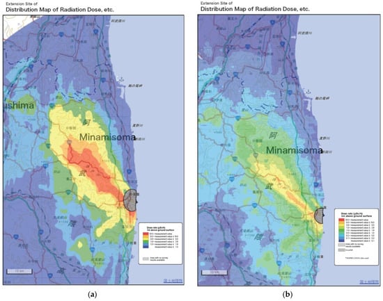 According to Capodici [56], the GCI heavily criticized the plans of the Japanese government to lift evacuation orders for many areas tainted by the Fukushima disaster in early 2018. This would affect about 50,000 people who would then lose their entitlement to compensation. Such long-term payments are made only to refugees from Fukushima Prefecture who were forcibly evacuated by order of the authorities. ‘Voluntary’ refugees outside the evacuation zones were given housing benefits by Fukushima Prefecture only until the end of March 2017 [57]. The GCI argued that the Japanese government was also obliged to support those people who previously lived outside the exclusion zones, but in regions that were excessively contaminated. If the primary consideration were for the actual needs of those afflicted by the disaster, then there should be no question of an indiscriminate zoning off and re-opening at all from their viewpoint. Instead, decisions should be made on an individual basis, even if an individual just wants to avoid certain situations because of irrational fears after the traumatic events. Drawing on debates in philosophy of mind and debates about the intrinsic value of subjective color experience, Paul [58] stressed the importance of subjective knowledge about a certain experience that can only come from undergoing it, with the experience changing an individual’s subjective preferences. Acknowledging the existence of the personal effects of such ‘transformative experiences’ might help improve political decision-making and thereby improve the relationship between the citizens and the state in the longer term. However, for the Japanese government to be able to make decisions in such a way that meets standards of rationality in the short term, the availability of reliable sources that offer sufficient justification for its decisions is certainly critical. A number of visual representations produced by government agencies, which will be introduced in the following section, give a good spatiotemporally-differentiated impression of the radiation situation in areas affected by radioactive contamination (for the effect of Fukushima on radioactivity in the sea, cf. Vives i Batlle [59]; on the pollution of food and aspects of monitoring, see the paper by Merz, Shozugawa and Steinhauser [60]).