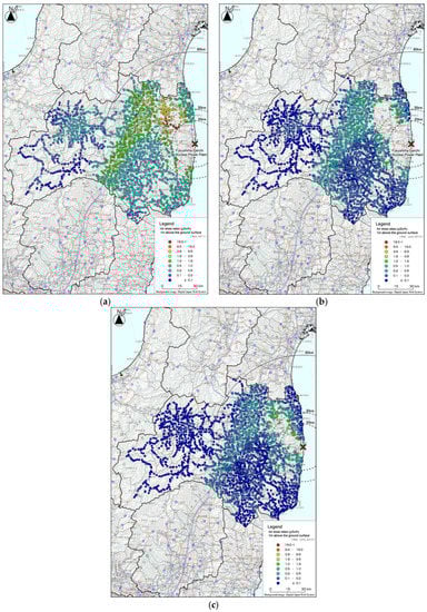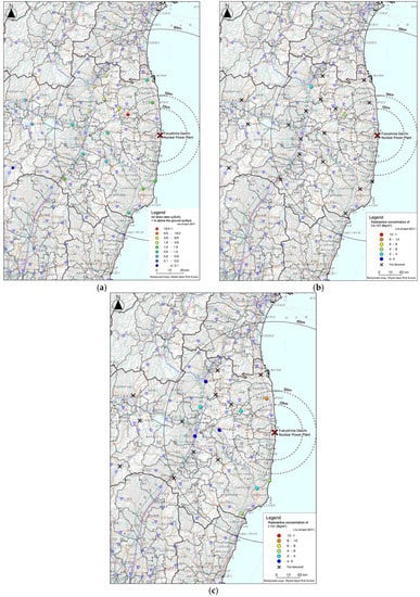 Local dose rates in measuring stations in Fukushima Prefecture (in µSv/h) during the periods: (a) 12–15 April 2011; (b) 13 May–5 June 2013; (c) 13 May–10 June 2015 [62].