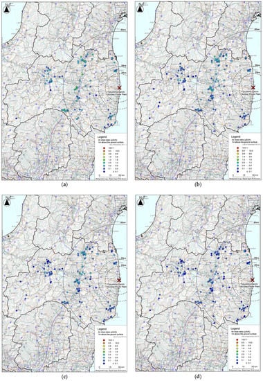 Results of radiation monitoring for child care facilities in Fukushima Prefecture as of (a) November 2011; (b) December 2012; (c) July 2013; (d) September 2014 (in µSv/h) [63].