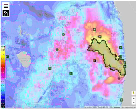 Aldrich [34] (p. 7–9] mentions the fact that, since Fukushima, interest in citizen science has grown in Japan and refers to the online platform Safecast (https://safecast.jp) as a successful example: a project developed by Japanese citizens for measuring, collecting and publishing data on radiation exposure, which is independent of official statements, free of comments and thus politically neutral [84,85,86]. The measuring of radioactivity is carried out with specially-developed Safecast radiation detectors that are linked to GPS and the Internet, so that data can be obtained every five seconds and then uploaded directly to their homepage. Figure 6 gives an example of the spatial interpolation of data that were gathered on 7 March 2017. The data are considered to be particularly reliable, and the public availability will also help people living at some distance from the evacuation zones to make their individual risk assessments. Hultquist and Cervone [87] therefore come to the conclusion that Safecast has massively encouraged citizen participation, promoted explorative learning, knowledge about radioactivity and radiation and hence self-determined decision making on the basis of reliable information.