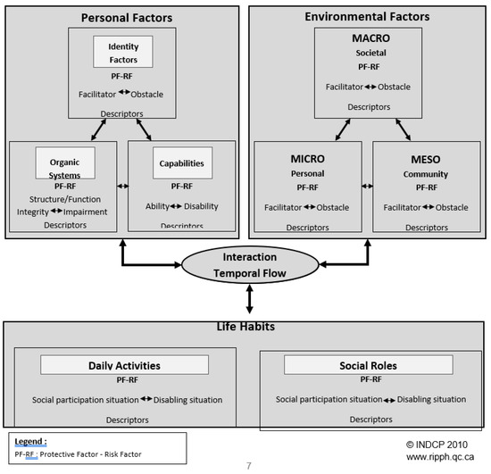 - Fougeyrollas, P.; St-Michel, G.; Bergeron, H.; Cloutier, R. The Disability Creation Process: Analysis of the Consultation, New Full Proposals; International Network ICIDH; Quebec Committee and Canadian Society on ICIDH: Quebec City, QC, Canada, 1991; Volume 4, pp. 8–37. [Google Scholar]
