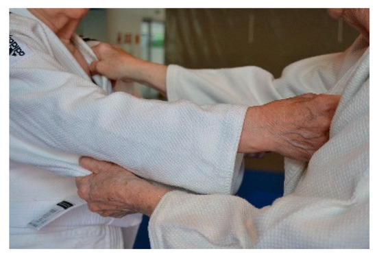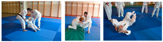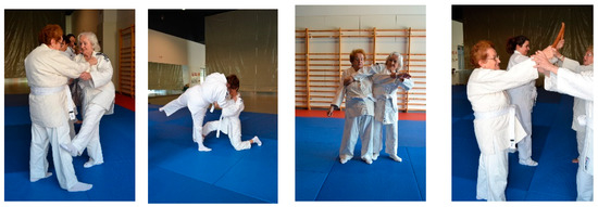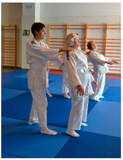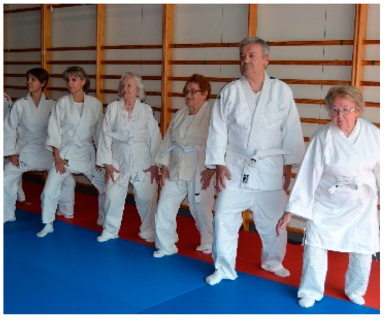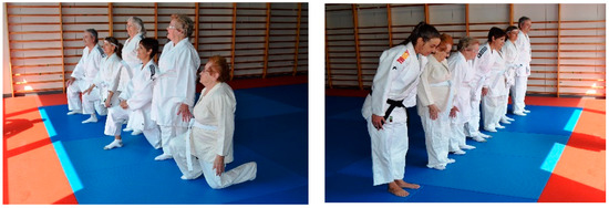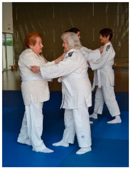 The intervention with the groups of older adults is organised following the structure of a traditional Judo session in order to take advantage of the extra motivation that this practice might generate by offering both health benefits and fun, which will be published in a future paper [29]. To design each proposal, in terms of timing, the start and development have been integrated into the pre-existing academic and sports programming schedules, to provide users with better access and assistance to the activity. With this approach, quarterly cycles of 36 sessions each have been programmed, giving an average of two classes per week, with a duration of 50 min per class. With this minimum organisation, it is intended to create a practice that is significant, sufficient, and that achieves ascription to the activity. The sports facility and materials used do not require adaptations. JUA’s practice is possible in any dojo or installation in which Judo is practised with low density gym mats being the only essential auxiliary material. The significant adaptations are made in the technical elements of the art and also in the execution of movements, starting from the contents of the black belt program and the Judo Katas, which are adapted to the abilities and functional needs of the participants. Specific adaptions are focused on avoiding any exercises that could pose a risk for the older adult population, as for example, eliminating the throws and replacing them by exercises in which older adult, assisted by companions, are taken from a standing position all the way to the ground.