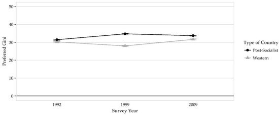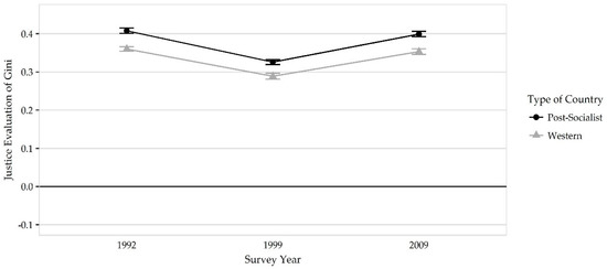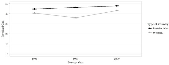 Lastly, I will focus on the perception of income inequality and look whether socialization provides respondents with different ways to view inequality in their respective countries. Figure 5 shows that respondents in post-socialist countries perceived a higher level of inequality than Westerners, which matches the tendencies that actually took place in post-socialist countries [69]. However, it also seems that there is a convergence between the two society types. Individuals in Western countries exhibit a gradual decline in perception of income inequality, and then again an increase, while in post-socialist countries the perception increases slowly throughout the 1990s and 2009.