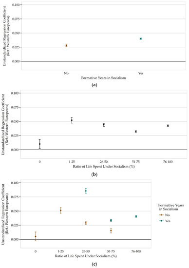 If socialization is seen as a bounded process, this mean it ends after the formative years. Thus, the most crucial influence for attitudes is what individuals experienced during these early years. Abramson and Inglehart [50], for example, argue that socialization has little effect after the formative years and subsequent experiences have little or no effect on attitudes. Therefore, socialism may only have an effect on individuals if they experienced it in their formative years, because one’s personality structure crystallizes by the time one reaches adulthood [51]. This would suggest those individuals, who did not grow up in socialism would be less affected by the socialist regime than those who had their formative years under socialism. Bringing together this argument with the assumption that the pre-1989 environment in post-socialist countries is vastly different than Western societies, we can expect that: