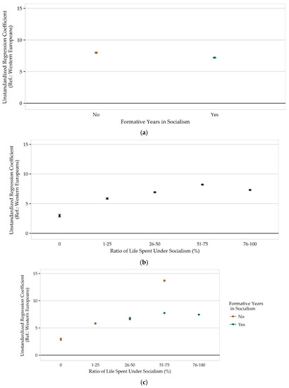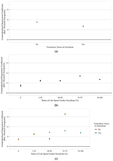 Lastly, it is plausible to consider the interplay of socialist experience gained in the formative years and the total experience throughout the lifetime. If formative years have primacy over all the experience one collects during their lifetime, then we can expect that individuals with a socialist socialization all through their socialist upbringing will have a similar distance from Westerners irrespective of how much other (i.e., post-socialist) experiences they have collected since the transition. In contrast, if the primacy of lifelong learning holds true, then individuals with similar exposure rates will have similar distance to Westerners irrespective of the nature of their formative years. There is a growing number of studies in various research fields emphasizing the importance of childhood experience [53,54] and their effect on values, attitudes, and behavior. In a most recent paper, Mijs [55] points out how beliefs formed in adolescence and in the first years of being a young adult tend to be durable. Accordingly, a third hypothesis is formulated, which relates to the formative years primacy thesis.