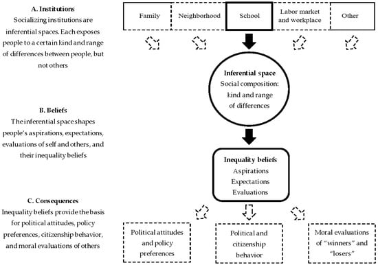 Sampson and Bartusch go as far as to suggest we conceptualize beliefs as stemming from different “cognitive landscapes” at the neighborhood and community level []. This concept helps identify the fact that, certainly in America, being poor, black, and living in particular neighborhoods importantly shapes a person’s social group and peers, interactions with authorities, and exposure to violence, among other formative experiences [,]. Whereas, arguably, this applies to all sorts of environments, it may be especially true for socializing institutions such as neighborhoods and schools [,,]. These institutions, more than others, constitute the context of adolescence, which research suggests is when young adults are particularly impressionable. Moreover, beliefs formed in these years are quite durable throughout a person’s life [,,]. Inasmuch as they provide a context to a person’s experiences and interactions with others, I argue, schools and neighborhoods are inferential spaces: they shape the development of a person’s inequality beliefs by exposing that person to a certain type and range of information, but not to their counterfactuals.