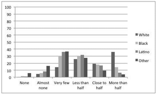 In our study, the questions about perceived community racial and ethnic composition are based on measures from the Project on Race and Ethnicity in Latin America (PERLA) surveys [69]. Respondents were asked to estimate the proportion of their neighbors who were of various races or ethnicities (white, black, Hispanic/Latinx, or other) using the following prompt: “In the present, in the neighborhood or community where you live, how many of your neighbors are …?” (answer choices included none, almost none, very few, less than half, close to half, and more than half). For the distribution of responses to these questions, see Figure 1 below.