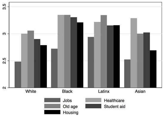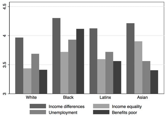 When we examine support for redistribution among our respondents by race (Figure 3 and Figure 4), we see that white people are generally the least supportive of redistribution, followed by Asians, then Latinxs, who are more supportive, and blacks, who are the most supportive.