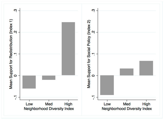 Our preliminary findings are more consistent with the contact hypothesis (H2). In particular, our findings suggest that both majority and minority group members living in more heterogeneous neighborhoods were more supportive of redistribution and social policies, although, as above, these results were seldom statistically significant. This positive relationship between diversity and support for social spending is consistent with previous studies conducted in another hyper-diverse city, London, and cross-nationally [28,71], and contributes to a growing body of research that calls into question the existence of the so-called “progressive’s dilemma” [28,52,72]—the idea that social democrats must choose between sustaining their traditional agenda of economic redistribution and embracing greater ethnic diversity.