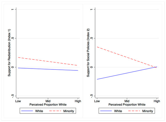 What are the implications for redistribution attitudes of living in racially/ethnically homogeneous communities for a member of a majority or minority group? In line with the contact hypothesis, in racially/ethnically homogeneous communities, there are fewer regular personal interactions with diverse groups. The lack of contact with individuals of diverse racial and ethnic backgrounds may reinforce prejudices and be associated with less support for redistribution policies, at least for members of majority groups. This idea is underscored by Simpson and Yinger’s early observation that “prejudice is sometimes explained by a lack of contact with members of minority groups…” [57] (p. 117). On the basis of this logic, we hypothesize that: