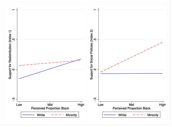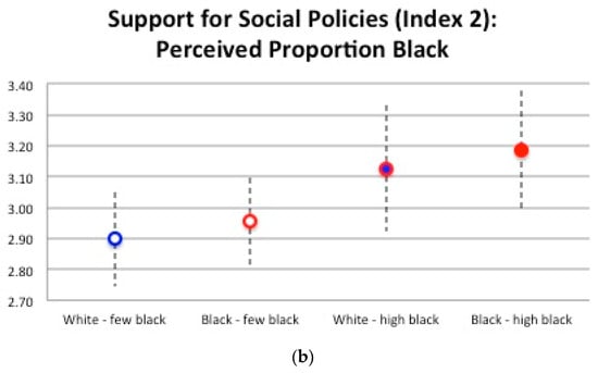 Predicted probabilities of support for redistribution (a) and social policies (b) by perceived proportion of whites for white and black respondents.