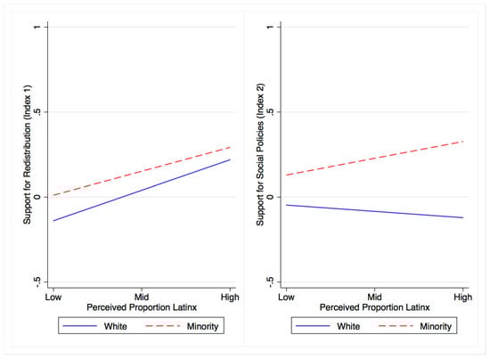 In Figure 6, we see that white respondents’ support for redistribution decreases slightly for support for redistribution (Index 1), but increases for support for social policies (Index 2) as the perceived proportion of white neighbors increases. In Figure 7 and Figure 8, we see the patterns of the effects of the perceived proportion of black and Latinx neighbors on support for redistribution and social policies. White respondents’ support for redistribution (Index 1) increases as the perceived proportion of black or Latinx neighbors decreases; support for social policies (Index 2) stays about the same as the perceived proportion of black neighbors increases, and decreases slightly as the perceived proportion of Latinx neighbors increases. Thus, the results of bivariate regression models yield limited evidence to support Hypothesis 3, about the effects of whites’ perceived in-group or out-group status on support for redistribution and social policies.