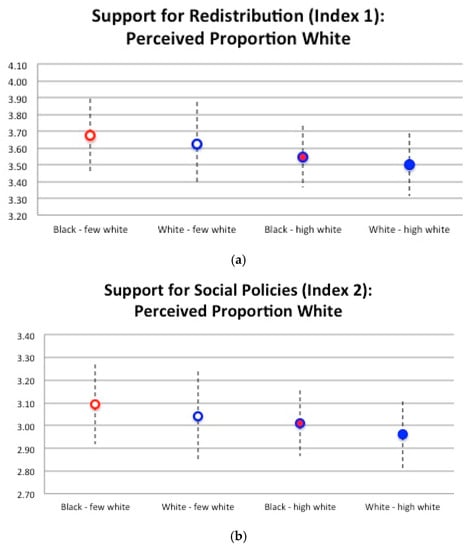 Our results also suggested some interesting differences between members of majority and minority groups who live in racially/ethnically homogeneous neighborhoods. Somewhat consistent with our hypothesis (H3), our results suggest that white people living with higher concentrations of white people (e.g., ethnic/racial homogeneity) are less supportive of redistribution, although these effects are not statistically significant. This is in line with previous work in Canada and the United States that reported that greater ethnic segregation in communities was associated with lower levels of social cohesion [73]. Additionally and as predicted (H4), black people perceiving themselves as living around high proportions of black people reported higher levels of support for redistribution and social policies. Interestingly, perceived proximity to higher concentrations of white people was associated with lower support for redistribution and social policies among both white and minority respondents. In contrast, perceiving oneself as living around high proportions of black people followed the opposite pattern.