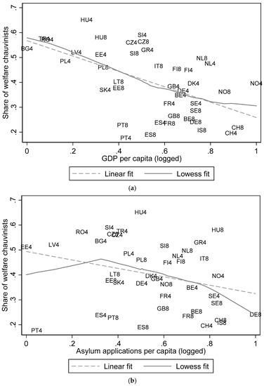 On the country level, worsening economic conditions have been shown to fuel support for the exclusion of immigrants from the welfare system, while the unemployment level and the size of the immigrant population seems to be unrelated to welfare chauvinism [10,13,20,37,38]. Furthermore, higher social expenditures [13,20] and social-democratic welfare regimes are associated with less restrictive views on immigrant’s welfare rights [37].