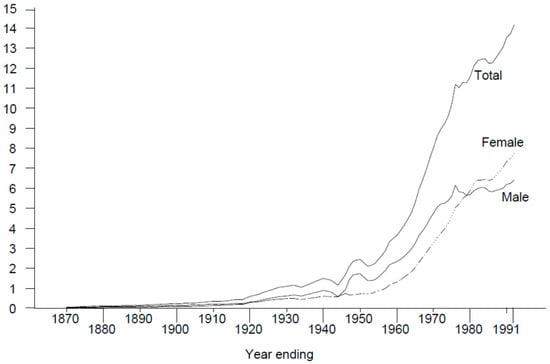 Enrollment in Institutions of Higher Education, by Sex—1869–70 to 1990–91, Millions Source: [] (p. 65).