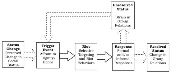 The riot model asserts that the social atmosphere becomes ripe for riots when members of one or more ethnic groups undergoes a perceived change in status that is not generally recognized and/or accepted. The ripeness increases as perspectives about ethnic group statuses become more divergent in society. This occurs when one set of ethnic group members perceives a status change has occurred, and as such, demand a change in intergroup norms. While during the same time another group of actors contrastingly expects intergroup behaviors to continue as they have in the past. The different set of actors’ diverse status perceptions creates an atmosphere that transforms everyday interethnic interactions into portentous status situations—interethnic incidents where the process of estimating the amount of honor—and, as such, worth that is expressed during the event becomes heightened. Consequently, even trivial or benign intergroup interactions during this riot phase can manifest into highly charged intergroup clashes. For example, Horowitz [] relates how various riot instigators and supporters justified attacks against target group members, because they perceived the target group’s attitude as inappropriate; it did not correspond with the instigator group’s perception of how the target group should behave: