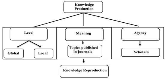 Two reasonable questions can be posed at this point: (1) How does scientific knowledge form an institution, and (2) which arrangements hold the institution of knowledge together? Relying on the relational and duality model [], and the “new institutionalist” model [], the theoretical proposition of this paper focuses on the conceptual scheme of knowledge production, where agents (editors, reviewers, and authors of scholarly articles) interact and fabricate meanings (topics) based on epistemological and methodical approaches reflecting the global and local orders of knowledge; these together shape the holistic intellectual fabrication of knowledge.