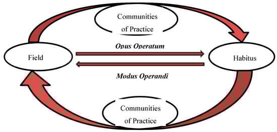The process of communicating ideas and philosophies classify distinct communities of meaning within the boundaries of a field. That said, the process of meaning production distinguishes the frontiers of unique epistemological entities and draws boundaries based on the selection of methodological and theoretical orientations []. The institutional mechanisms generating distinctive symbolic meanings are included in Bourdieu’s field theory. For Bourdieu, fields and practices (praxis) are two inseparable elements forming grand theories1. Fields are constituted by social spaces, or domains, in which agents are involved to a functional form of action (praxis). The structural constructivist perspective explains their formation through individuals’ intrinsic consensus of taking action (praxis). Shared mental images, common patterns of meanings assigned to linguistic terms, and identical perceptions on values, beliefs, and views over social artifacts are some characteristics of habitus. That said, fields can be viewed as equivalent to institutional spaces, where the social positions of their agents are featured by “cultivated dispositions” [,]. Fields also refer to macro structures setting the loci of social spaces. There are no formal rules within a field, but there is a set of practices and strategies internally inherited by the agents. Therefore, fields generate dynamic systems of expectations inherited by the agents who act based on the field-specific regulations [,]