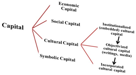 The formation of a field begins with one fundamental rule; agents must act in their social space. The entire framework of actions is accumulated to a single conceptual term: practice (praxis). In Distinction, Bourdieu proposed a theoretical model where he denoted the association between field and practice. In simplistic terms, agents develop routinized activities dependent on the availability of resources and produce a symbolic system of shared meanings. Habitus refers to the active role of the agent in the process of constructing a social reality through conceptual schemata, feelings, thoughts, verbal expressions of ideas, and practical manifestations [,,]. Figure 3 below graphically classifies Bourdieu’s forms of capital, with an emphasis on the cultural capital, where the institutionalized cultural (knowledge) capital generates objectivized forms of knowledge (i.e., journal articles) that results an incorporated mode of cultural capital.