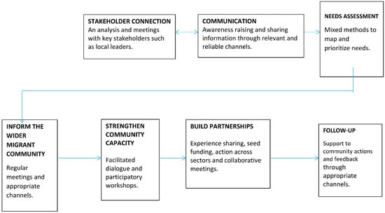 The unfamiliarity with a specific cultural context can make it more difficult to understand the reality of the situation and this can influence the delivery of services. A team comprising both practitioners and migrants can provide the most suitable approach when working in a cross-cultural context. Language often presents issues for how people communicate across cultural divides, for example, during face-to-face consultations. However, intercultural communication is not only about language and although interpretation services are important [] culture determines how migrant communities function at a local level and how they may or may not uptake healthcare services. The following framework (see Figure 1) uses a systematic approach through seven key steps to help overcome cross-cultural issues to engage with communities: 1. stakeholder connection; 2. communication; 3. needs assessment; 4. informing the wider migrant community; 5. strengthening community capacity; 6. building partnerships; and, 7. follow-up.