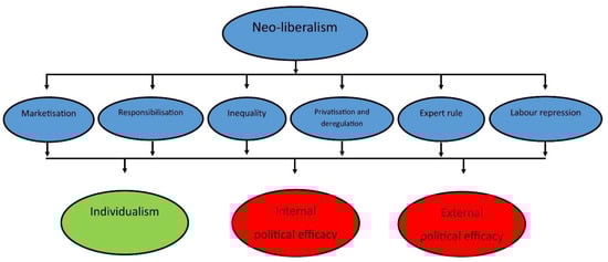 40]. It is important to note here that we are not advocating the simplistic and misguided view of neo-liberalism as invoking simple binary divisions between state and market—we recognise, as noted above, that the state is used to further advance market or market-like processes into increasing spheres of life, and that neo-liberalism is not about a simple stripping back of the state. Our contention, however, is that the states relevance to citizen’s lives, in terms of welfare, education or health, is severely curtailed under neo-liberal governance, whilst that of private providers grows. It appears then that privatisation and deregulation could be impacting political engagement both by transferring areas of policy from public into private hands (directly limiting the range of options for democratic expression), but also undermining faith in the capacity of collective institutions—a decline in external political efficacy, and potentially, by restricting citizens’ access to important resources needed to develop political skills, internal political efficacy too.