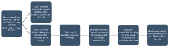 Users combine several levels of discourse when they produce articulations of text and image online, making it impossible to decipher the various meanings by simply analyzing text and/or images separately. Rather, articulating the two produces a cascade of meaning effects that can be best seized by a semiodiscursive analysis, drawing attention to what is given access to representation and what is not; and with which framings. A qualitative analysis of text–image relationships therefore benefits from successive re-examinations of different samples of tweets extracted from the sources, making it possible to identify original discursive forms that a quantitative analysis would otherwise have concealed. Therefore, while a keyword-based selection has been proven reliable, subsampling, successive filterings, and semiodiscursive analysis have proven to be useful tools to identify, select, and interpret complex productions of meaning, notably in text–image articulations. This is all the truer in that a qualitative analysis of tweets rapidly shows how users opportunistically reference “trendy” subjects when discussing topics that actually have little to do with them. Our research was rapidly confronted with individuals evoking Ebola and semen for other reasons than actually discussing the topic at hand (i.e., the sexual transmission of Ebola), or posting images of Ebola that had little to nothing to do with the disease or the health crisis. This led us to further tap into primary sources in order to select tweets that were truly related to text–image relationships during a health crisis. We emphasize that a purely quantitative selection of a corpus in these sources would not have identified these tweets. For this reason, our qualitative analysis of tweets relied first and foremost on constant subsampling, identifying both the generic terms indicating the presence of an image and the words most used to discuss the sexual transmission of Ebola. Our investigation, based on selecting 6000 tweets out of the corpus, reading them, and manually coding them, confirms that the analysis of complex meanings presented as a combination of text and image cannot skip a human interpretative stage, which itself requires constant recalibrations.