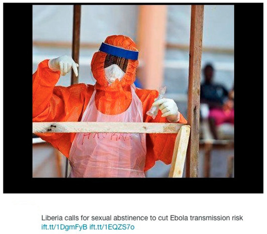 Figure 4. Repetition. - Complementarity (Figure 5). Finally, we noted complementarity between text and image, as when a tweet comments on a WHO prevention poster advising to “Abstain from sex if you start feeling ill. #Ebola” by adding “FACT: CDC advises #Ebola virus can remain in semen for >3months after recovering from Ebola. #Abstain or #safesex.” Images are often a second discourse, a way of saying something more than what is in the text.