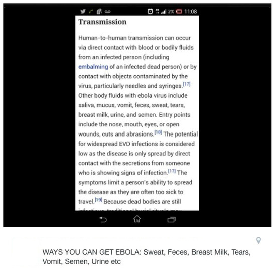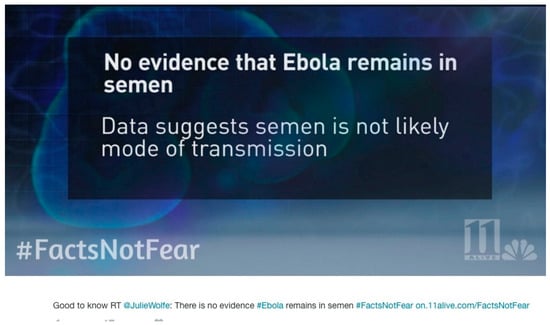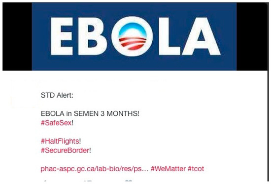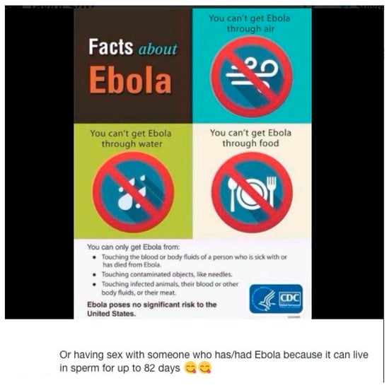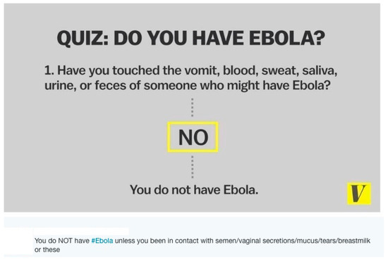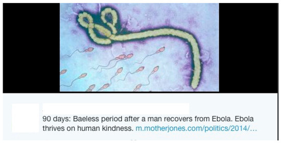 - Seltzer, E.K.; Jean, N.S.; Kramer-Golinkoff, E.; Asch, D.A.; Merchant, R.M. The content of social media’s shared images about Ebola: A retrospective study. Public Health 2015, 129, 1273–1277. [Google Scholar] [CrossRef] [PubMed]