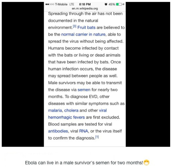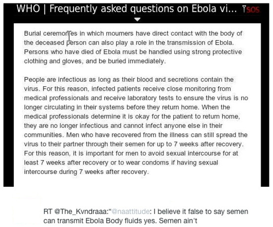 A large proportion of tweets (38.8%) are related to fear, whether they express various fears or serve to scare others, or they relativize the danger and offer reassurance regarding the low risk of contracting Ebola. When fear arises in discourses on the sexual transmission of Ebola, tweets follow the same pattern. Texts mostly share the information (“Research shows Ebola can be found in survivors’ semen for weeks or months after recovery”, “90 days: Baeless [sic] period after a man recovers from Ebola”), sometimes adding emphasis on the concern such news evokes (“It’s possible that Ebola can be sexually transmitted. More on the scary news here.”) or eventually taking a political stance on closing borders (“STD Alert: EBOLA in SEMEN 3 MONTHS! #SafeSex! #HaltFlights! #SecureBorder!”). In juxtaposition with such texts, images firstly show symptoms: The sharing of frightening images, particularly of blisters, evidently aims to illustrate how aggressive the virus is. Secondly, screenshots from online encyclopedias (Figure 11) are used to support what is hard and maybe difficult-to-believe news (“Yu can get ebola thru unprotected sex from what im reading”, “Ebola can live in a male survivor’s semen for two months!” accompanied by a Mask Face emoji).