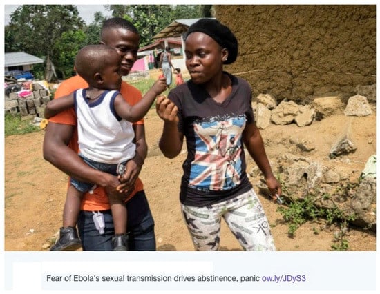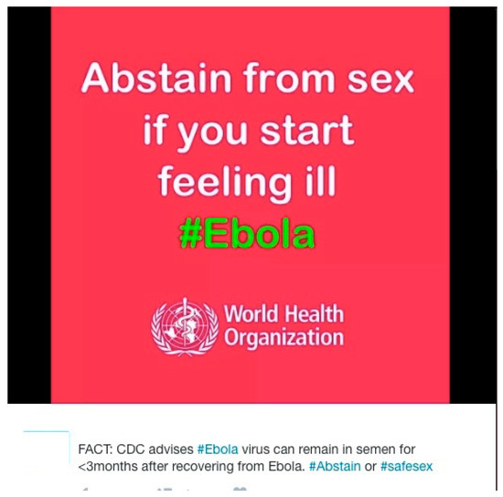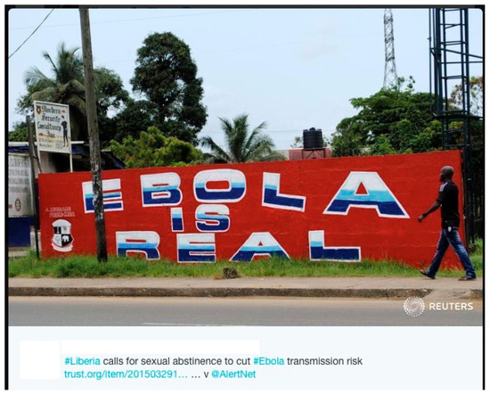 Moreover, as Joffe and Haarfooff [27] pointed out, the high frequency of westerners wearing Hazmat suits gives the impression of a disease that was “controllable by western science, [as] part of a world of make-believe, of science fiction”. Another example of how images frame the event differently is that while all headlines containing the word “condom” are very similar, the accompanying illustrations vary. Although the texts are repetitious—“#Ebola survivors told to use condoms - virus can live in semen for 70+ days”, “Ebola survivors told to use condoms to prevent virus spreading”, “Male #Ebola survivors told to use condoms”, “Ebola survivors told2 use condoms #West #SouthAfrica”—the images are as varied as condoms, a man washing his hands, a man walking outdoors in front of a prevention sign bearing the slogan “Ebola is real” (Figure 8), or a microscopic view of the Ebola virus.
