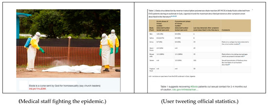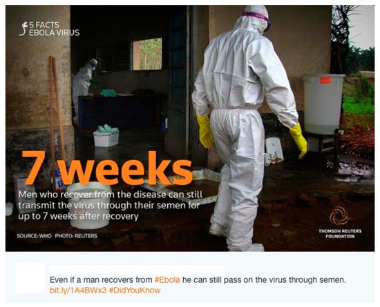 Figure 2. Illustration. - Commentary (Figure 3). Text–image combinations can also be used to provide commentary (21%), for example when texts contradict or doubt the information contained in the image (“RT @Th…:@na…: I believe it false to say semen can transmit Ebola Body fluids yes. Semen ain’t” accompanied by a screenshot of the WHO’s FAQ webpage mentioning the sexual transmission of Ebola).