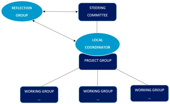 From this phase, each consortium had to appoint a local coordinator, working at least part-time for the project and whose role is described below. In order to achieve these tasks, the coordinators and their consortia members were assisted by external coaches hired by the authorities. The coaches had, inter alia, the mission to provide the coordinators with methodological assistance regarding the analysis of the existing situation in their pilot zones and the conception of the loco-regional action plan []. Therefore, at the beginning of the conceptualisation phase, the coaches suggested a non-mandatory governance structure for the pilot projects specific to this phase, which is represented in the organisation chart below (Figure 1):