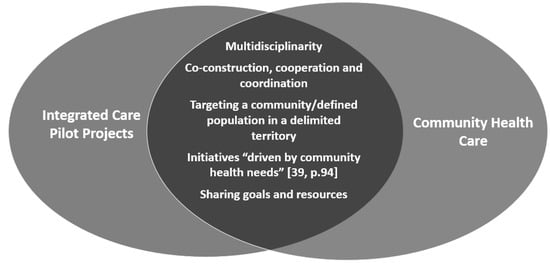 This way of working led progressively to the emergence of the early stages of a new culture of horizontal collaboration between pilot project members. Indeed, during the preparation and the conceptualisation phases, numerous different people, who might not have otherwise met, came to work together and learned from each other []. They made different worlds communicate [] and began to alleviate the traditional fragmentation between first- and second-lines of care. The project approach ignores frontiers [] between professions, hierarchic levels, or sometimes even between structures. By also including non-medical stakeholders, the pilot project consortia even extended to the community, the involvement of which is crucial for the development of integrated care according to the scientific literature []. In this way, they began the development of what could become (and what the researcher would call) collaborative community health networks or collaborative community health microcosms in the future. As proof of this, the elements shown in Figure 2 below characterise both integrated care pilot projects and community health care [].
