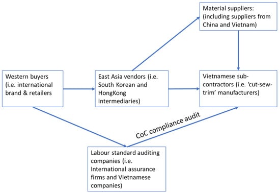 Most Vietnamese producers are ‘cut-make-trim’ subcontractors to East Asian companies, called ‘vendors’ who have direct contracts with Western brands and retailers [68], as illustrated in Figure 1. It is estimated that 70% of total clothing export from Vietnam is produced through ‘cut-make-trim’ orders, while only approximately 9% have direct contract with brands and retailers [69]. The industry employs approximately 2.5 million workers, of which more than 80% are female and 75% are unskilled and untrained workers [70] due to the fact that the majority of the manufacturing work is sewing. CoC compliance audits at Vietnamese sub-contractors are conducted by third-party audits, commissioned by Western buyers [23].