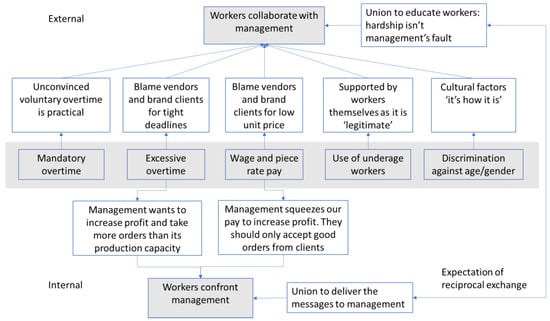 CoC advocates the application of effective collective bargaining and unionism similar to the model of employment relation in the West [53,54], with a formal structure and procedure in place to enable meaningful bargaining with employers. From the social exchange perspective, this form of collective bargaining tends to represent the direct negotiated exchange in which actors jointly negotiate the terms of an agreement that benefits both parties, either equally or unequally [55]. Unions, on behalf of workers, negotiate with management on the terms and conditions of the work and benefits for their members. In this situation, the benefits for workers are pre-determined and agreed upon [56,57]. However, research which adopt this conception of collective bargaining show that this form of labour activism at the bottom of the supply chain remains problematic [5]. This is because some preconditions, such as the recognition of injustice and the willingness to form and lead collective actions, which set a foundation for effective collective bargaining [58], are yet to be materialised at the workplace.