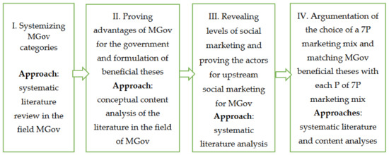 After the pilot literature review, we found out that the benefit of MGov was revealed only for the downstream audience. There is a lack of research specific to the upstream audience (or the government bodies) who play the primary role in the construction of the public governance. Therefore, we used the literature analysis to find any definitions or inscriptions concerning the advantages for a government. All collected data was grouped (or systemized) into specific categories, and specific theses proving the theoretical benefit for the government bodies were related to an appropriate category of MGov. An approach of conceptual content analysis was also used to distract these advantages as beneficial theses. These theses later were matched with the appropriate P of 7P marketing mix.