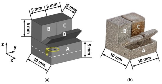Figure 2 illustrates the geometry of the specimen. It can be described by two cubes (B and C) of 5 mm edge length on top of a base cuboid (A) of the dimensions 10 mm × 10 mm × 5 mm, as cubes of this edge length are often used for L-PBF parameter studies. It also kept the field of view small for the optical monitoring equipment. Next to the cubes B and C inclined ramps (D) with an inclination angle of 40° and 45°, respectively, were placed. However, these ramps D were not subject of investigation in the course of this study. The specimen was removed from the build base plate by saw-cutting, the approximate position of the cutting line is depicted by the white dotted line. The base cuboid A contained artificial defects: In layers 61–73, an area of 0.6 mm × 3 mm was not exposed to the laser scan, followed by a non-exposed area of 0.37 mm × 3 mm in layer 74 at the same x-y-position. This region was called cavity in the course of this study. In layer 88, an area of 1 mm × 2.04 mm was not exposed at one corner. Both defects were open defects in the meaning that they were not enclosed within the part but are located at the edges.