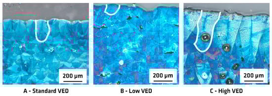 In addition to non-destructive inspection by µCT, destructive metallography was used to analyze the specimen. Therefore, polished cross sections of the specimen were etched using Beraha II etching detergent for 10 s to 30 s. Measurements of melt pool depth were conducted at light-microscopy micrographs for the three distinct parameter sets used in volumes A, B, and C. Light-microscopy was conducted using a Polyvar Met (C. Reichert Optische Werke AG, Wien Austria) which was equipped with a camera DFC290 (Leica Microsystems GmbH, Wetzlar, Germany).