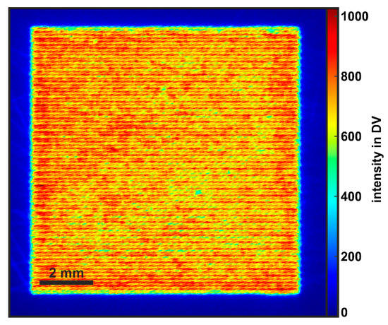 Contrary to thermography, the optical tomography camera recorded only a single image per layer exposition. Optical tomography recorded a signal which was proportional to the radiation intensity, emitted from the area on the specimen that was imaged onto the respective detector element (pixel), integrated over the duration of the entire layer exposition. Under normal process conditions, the highest temperatures within the melt pool would have contributed predominantly to the signal due to the nonlinearity of the temperature-intensity dependence despite the very rapid cooling. Therefore, the hatching pattern of the layer exposition can be seen in the optical tomography images, as depicted in Figure 7. However, since the measured signal was only proportional to the time integral of the intensity, it could not be distinguished between areas on the build surface that had an unusually high temperature and those that had an unusually low cooling rate at moderate temperatures. Nevertheless, both occurrences might have been indications for process deviations that might have induced the formation of defects. Thus, for defect detection, threshold analysis operating on the raw signal data were applied.