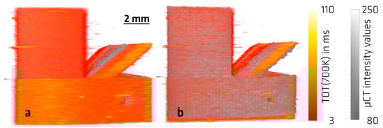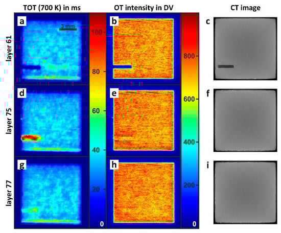 In Figure 6c, a map of the TOT of an apparent temperature of 700 K is shown for the layer formation of Figure 6, which did not contain any defects, as found by reference measurements. The increased TOT at the lower side of the image was caused by a reduced cooling rate in this area, probably due to a heat accumulation due to the absence of solid material on the further lower hand side (only powder with reduced thermal conductivity is present here). Contrarily, as observable in Figure 6b, the final cooldown at the end of the exposition (blue curve) was faster, since the laser stopped the continuous heating of the part after the last scan track was exposed.