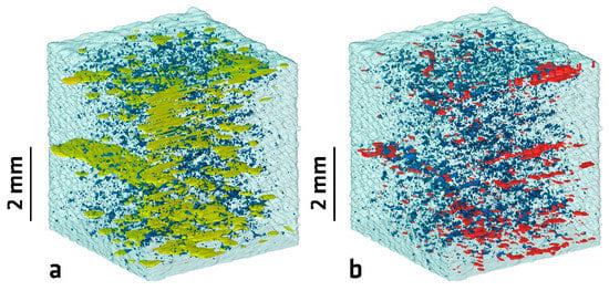 Rendering of the transparent surface with overlap of defects detected in µCT, thermography and optical tomography in Volume B. (a) Blue–µCT defects, yellow—thermography irregularities of TOT (700 K) greater than 30 ms; (b) red—optical tomography with more than 700 DV.