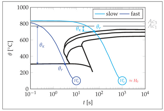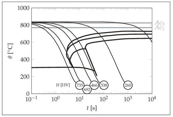 During heating, the microstructure of carbon steels starts to change to austenite by diffusion processes, if the temperature is greater than and which finish at . Both, and , depend on the rate of heating, which is documented in time-temperature-austenitization (TTA) diagrams as found in [10]. During cooling, the reverse transformation deviates from this and primarly depends on the cooling rate, which is documented in continuous cooling transformation (CCT) diagrams as depicted in Figure 1. Further information in the CCT include the microstructural composition as well as the hardness H, typically in Vickers hardness (HV),which occur at different cooling paths.