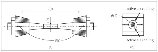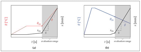 In both routines, the specimens were exposed to linear temperature and displacement profiles in the evaluation range (Figure 4). This allowed us to gather information about the flow properties for a number of temperatures in a single test. In order to examine different ranges of and , the start temperature was varied as well as the stroke rate . A drawback of altering these parameters simultaneously was that factors such as crystal recovery, recrystallization, and grain growth remained inseparable from the thermal dependence and were therefore averaged in the evaluation of the tensile tests. To overcome elastic deformations, pre-stroke was set to 0.3 mm, before the actual evaluation range begins. A comparitive summary of the test conditions during heating and cooling is provided in Table 2.